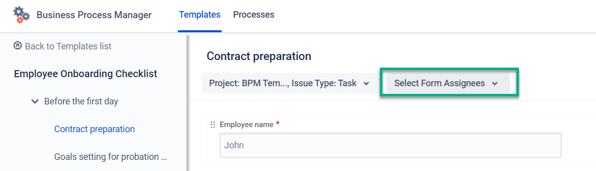 Select the assignee from the drop-down list. You can select one or a few Users or User Groups. This list reflects users and groups assignable to Selected Project – BPM Templates (BPM).