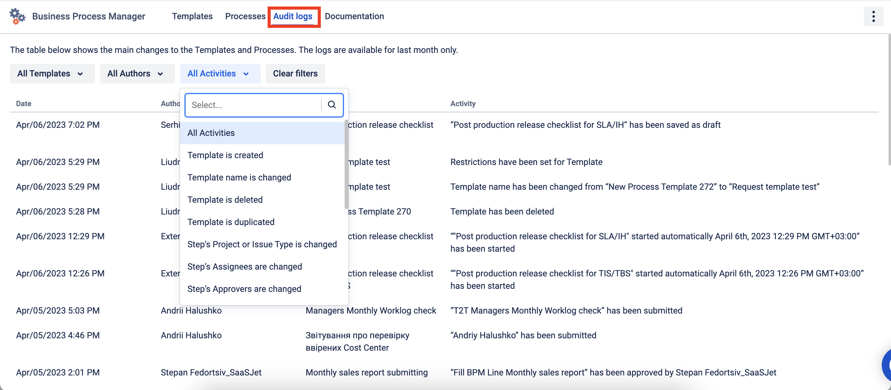 Easy monitor your project with the ability to filter by Template, Author, or Activity from the drop-down list. Activities that can be filtered include Template creation, changes to Template names, deletion or duplication of Templates, changes to Step Project or issue Types, Assignees, Approvers, Blockers, Due Dates, Form logic, Restrictions, Schedule, Tags, Process start, and Blocked Steps start.