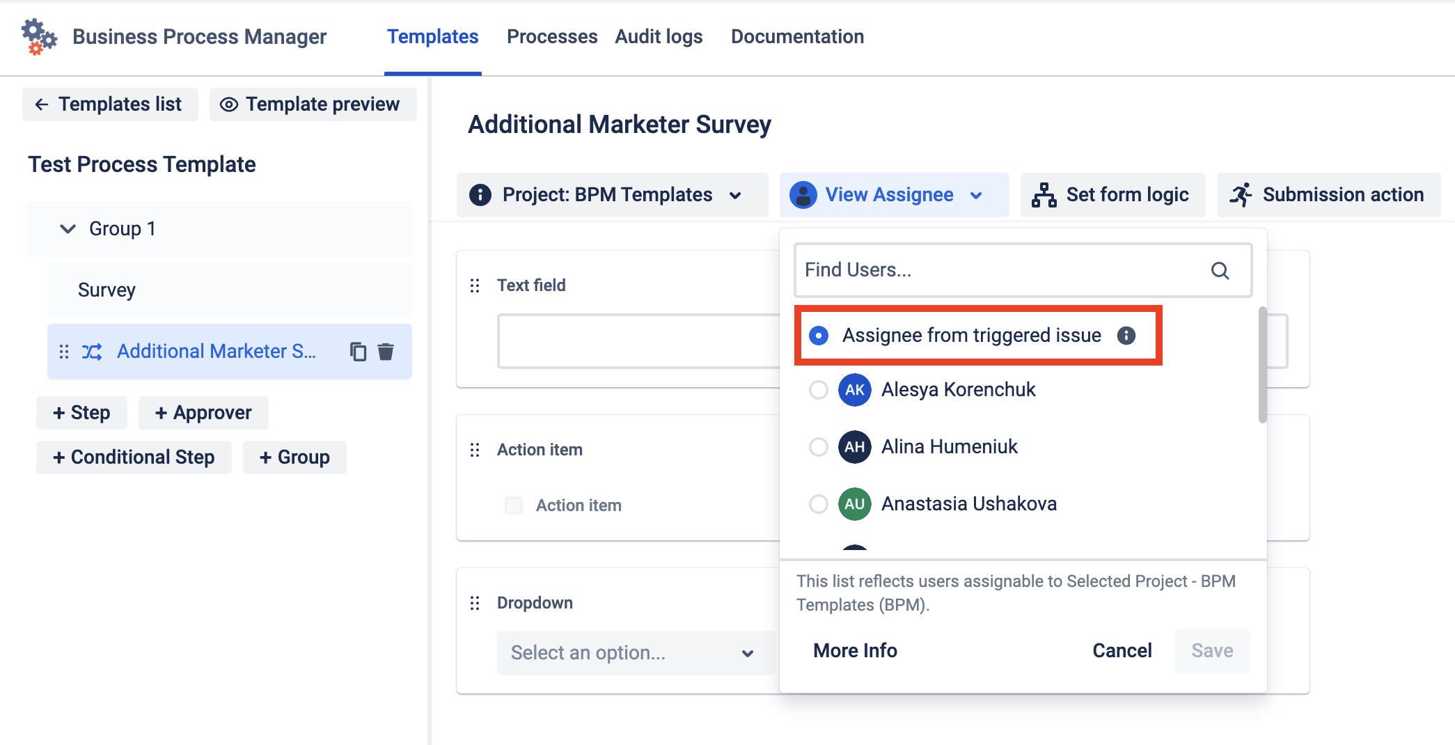 Also, in the Conditional Step, in addition to the simple Assignee list, you can set the Assignee from the triggered issue. So, when the option of the Step Form element after submission will run the Conditional step, it will set Assignee from the main Step that selects this option.