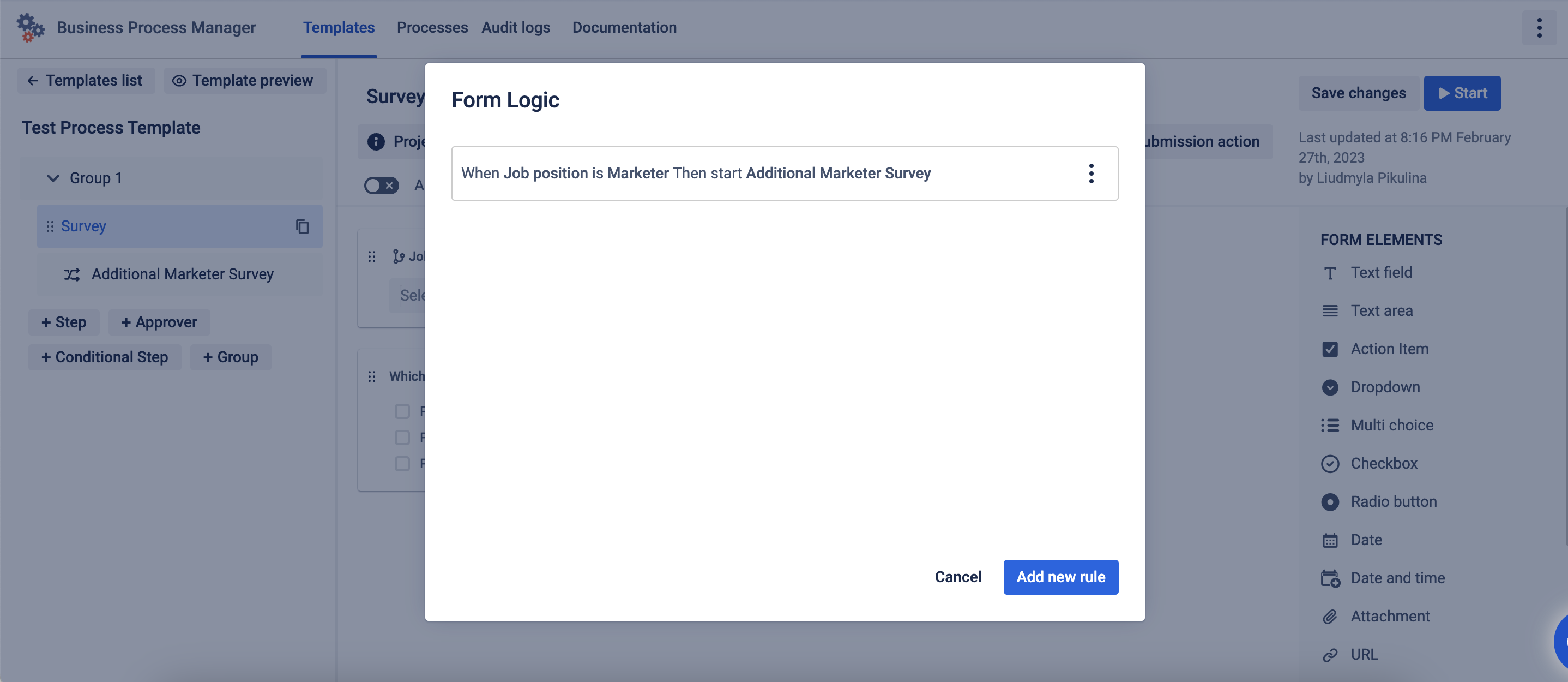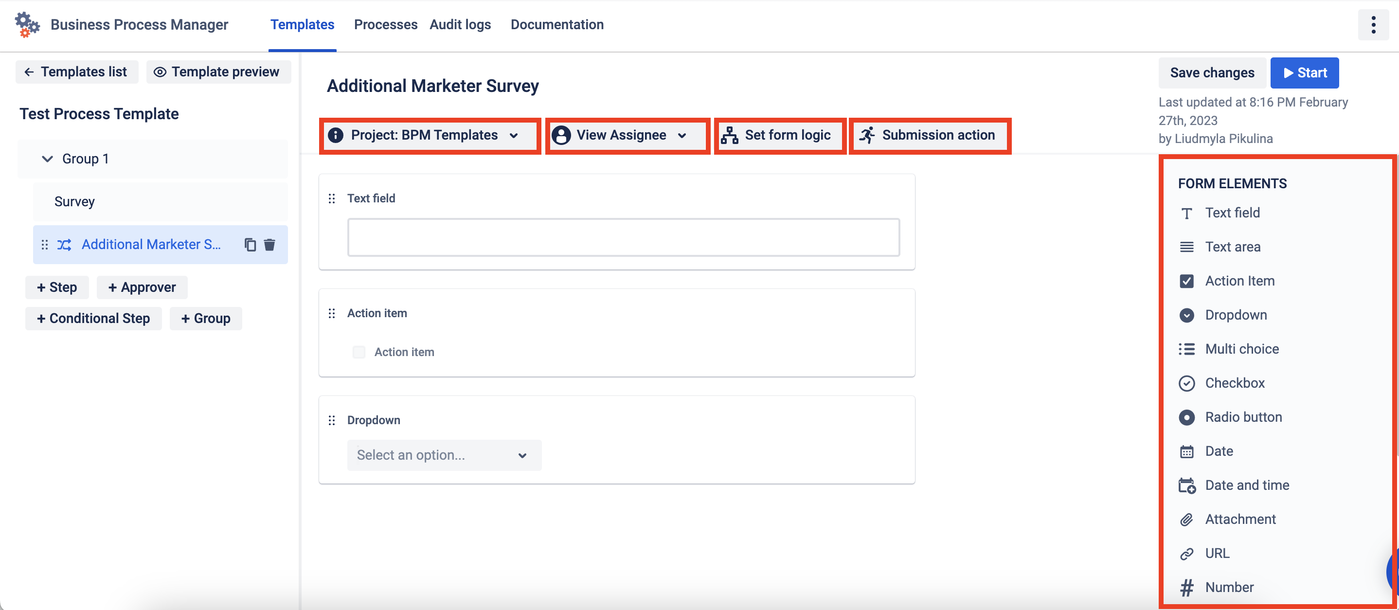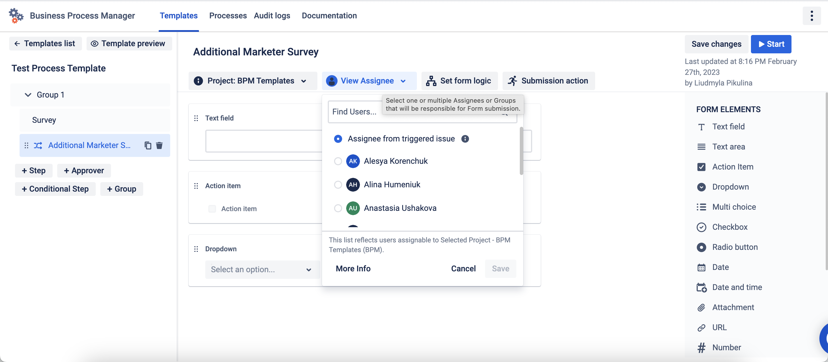 For Step add the Forms element and set Project and Assignee. And don’t forget to add one of the multi-choice elements (dropdown, multi-choice, checkbox, radio button) then set Form logic.
