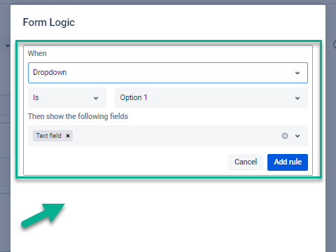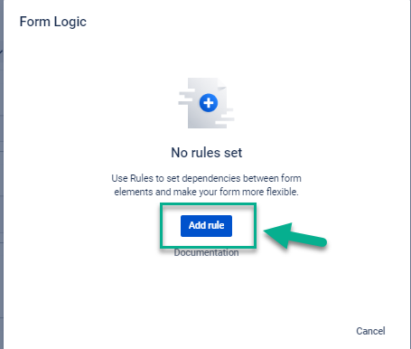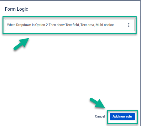 Click the “Add rule” button. It works based on the If/Then rule only for such elements: drop-down, multichoice, checkbox. So you can add different variants for your elements (a, b, c; 1, 2, 3; etc)