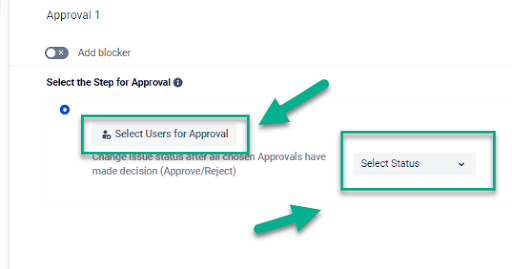 Choose the Issue status an issue will get when all chosen Approvals have made a decision. (Approve/Reject) Click “Select users for approval”.
