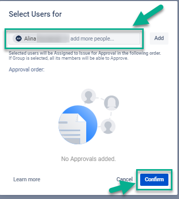 Click “+ Approver” to choose a person who will approve the completed actions. The Approver is a person that check the correctness of a previous step and approve it for further process.