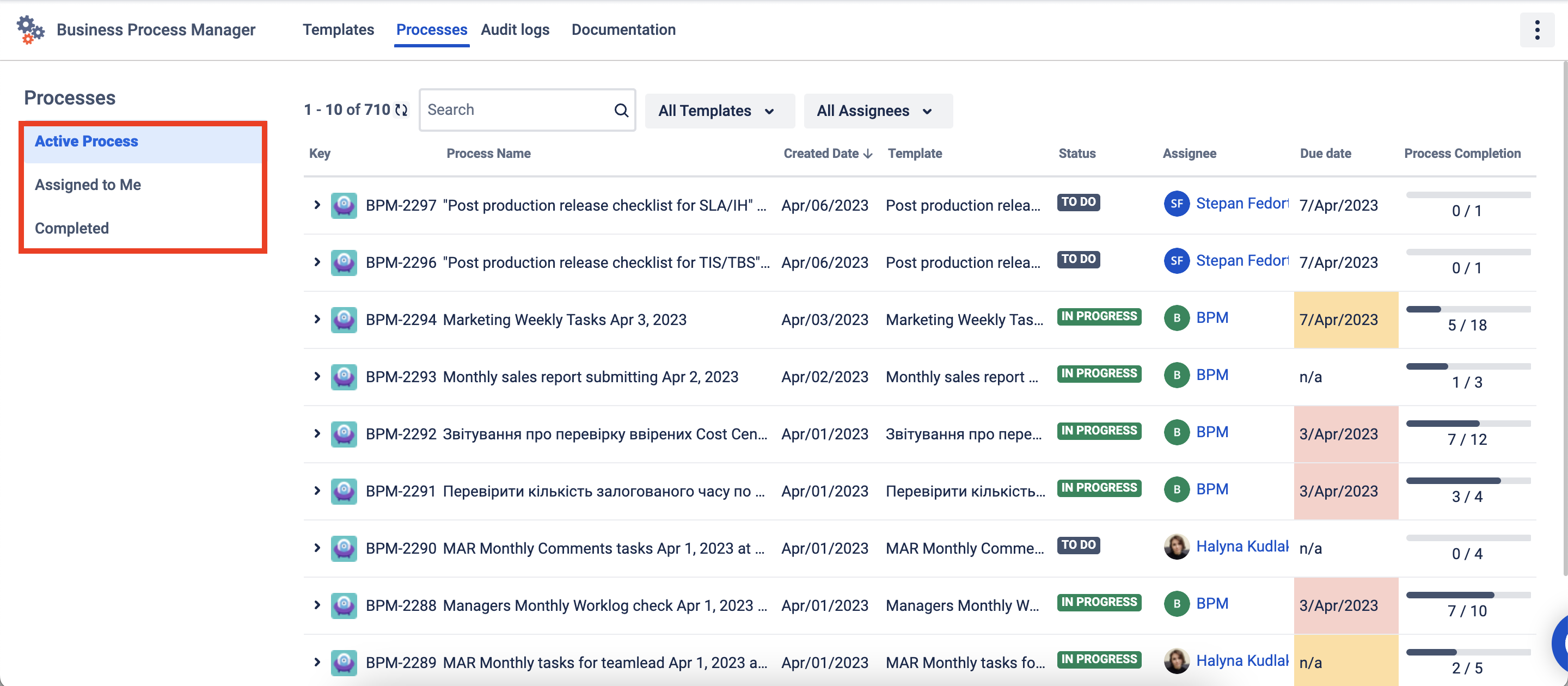 Optimize your workflow by using the search function to find processes based on keywords, or filter the list of processes by Template or Assignee.
