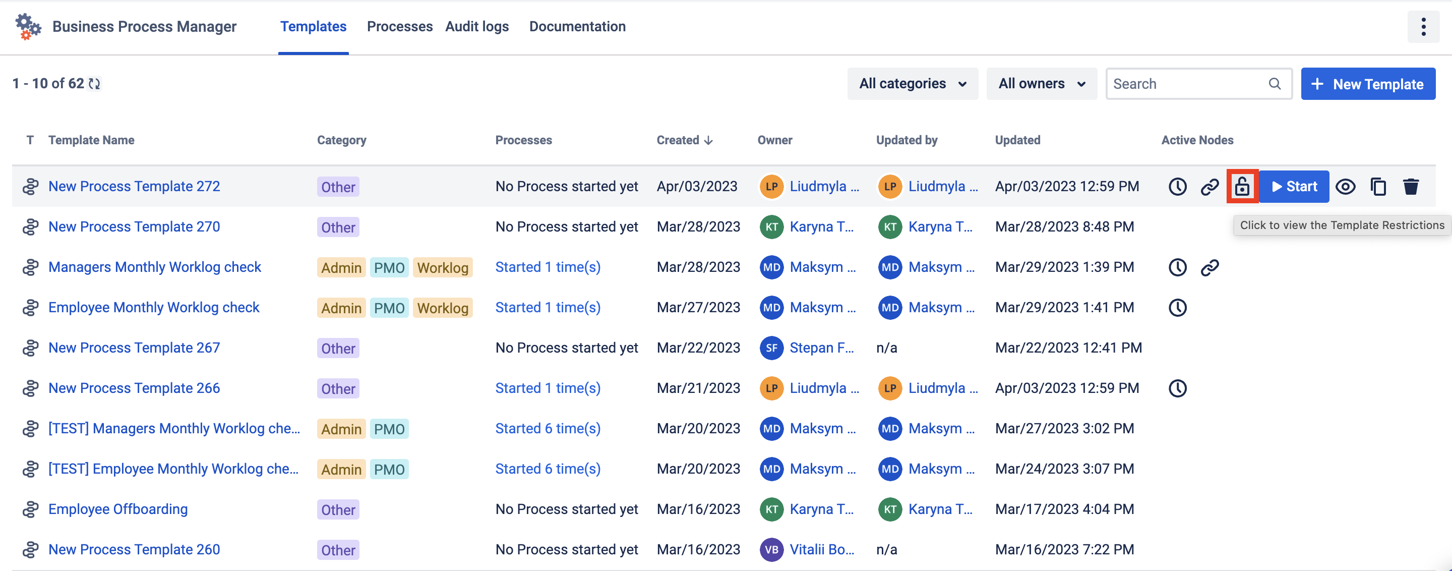 Once Template has received a restriction, all subsequent Processes will be available only to those who have access.