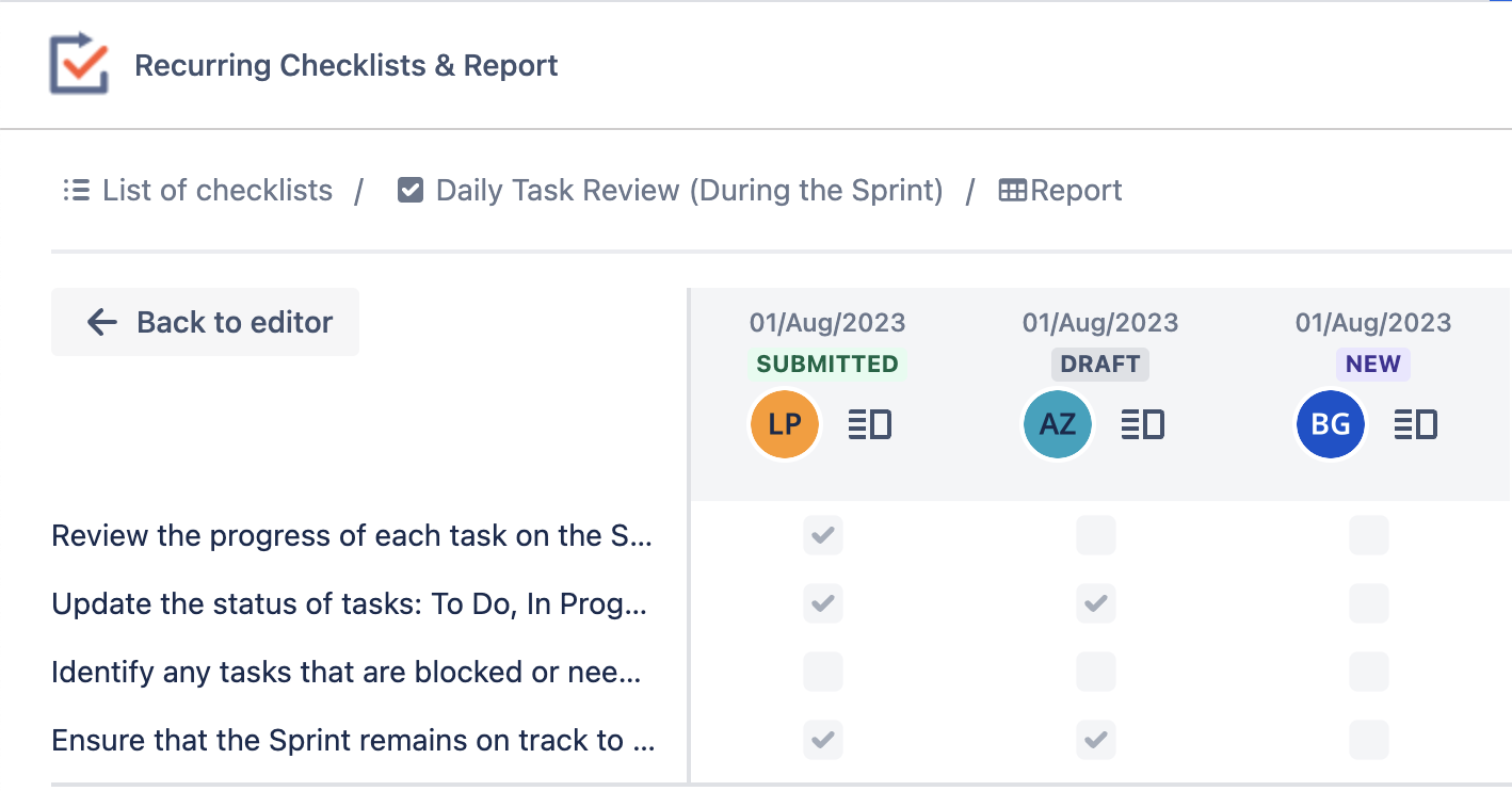 On the left side, you'll find a list of checklist items, each accompanied by the submission result within the designated timeframe. Each cell contains information about whether the checklist item is checked or not.