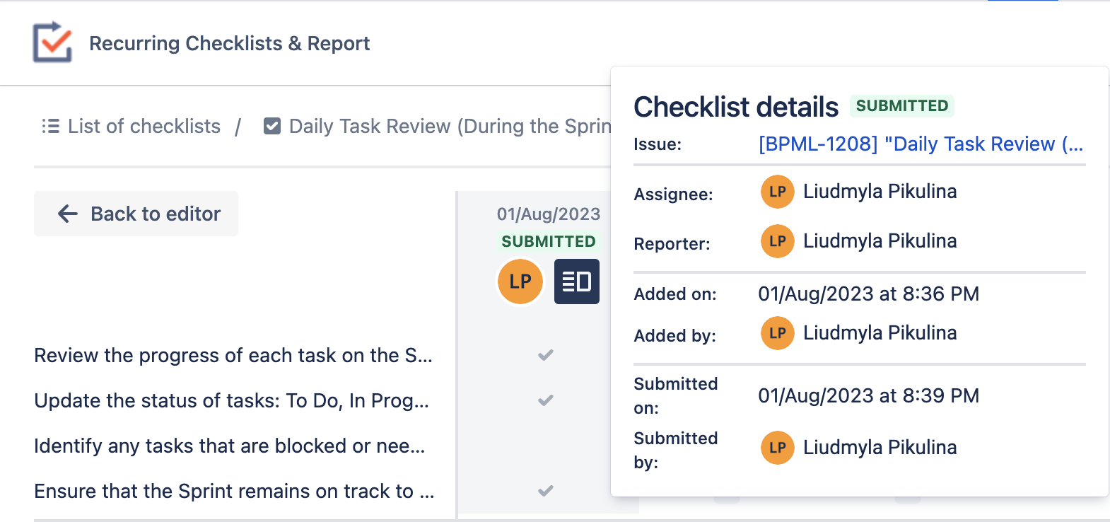 The additional details section includes information about the issue reporter, assignee, the issue where the checklist is placed, and more.