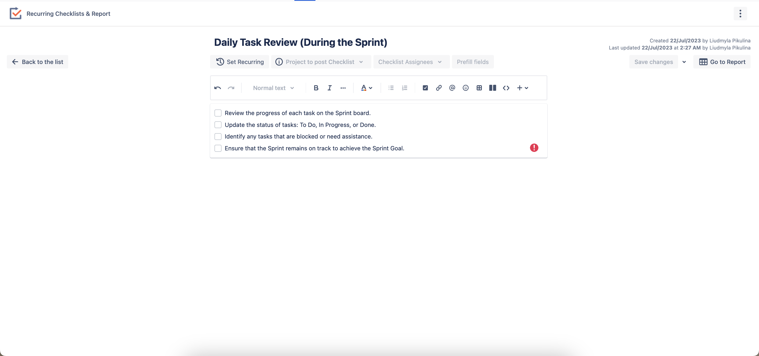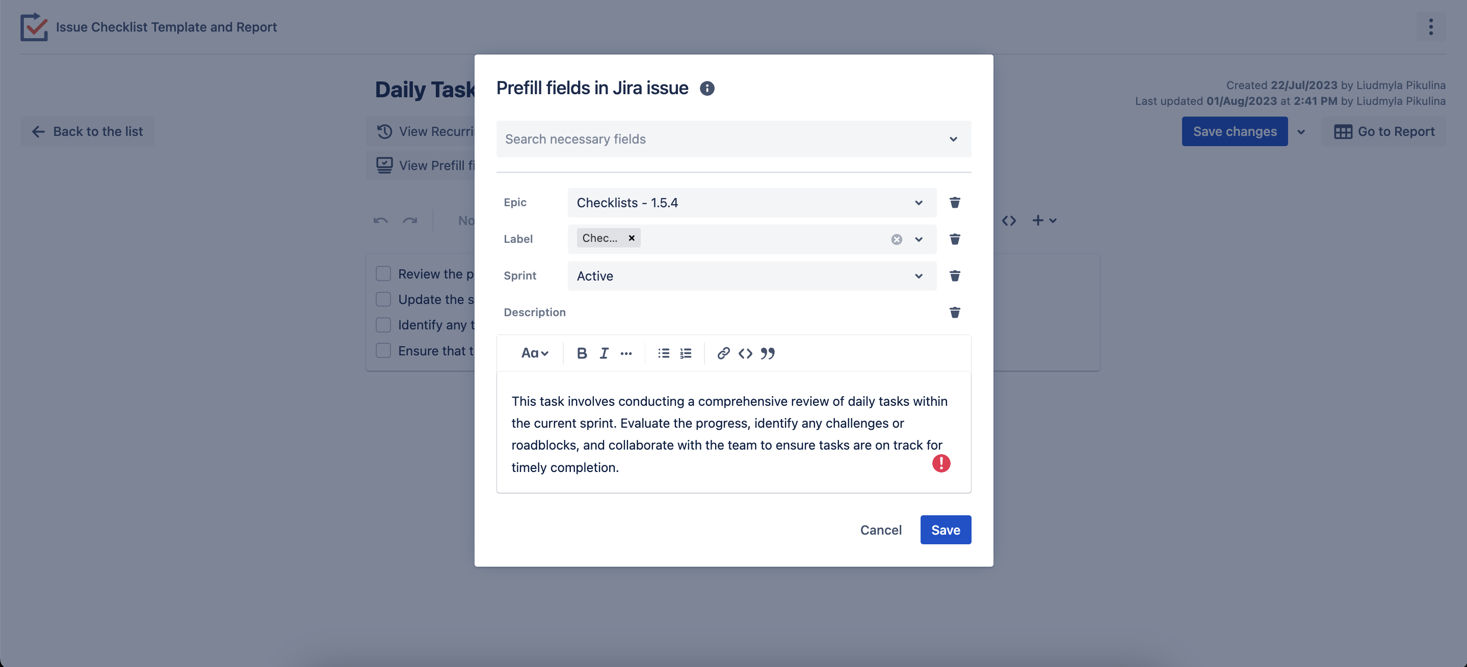 Ensure to save all the changes you have made. Going forward, every time this recurring task with a checklist is generated, it will include a prefilled description, label, sprint, and epic. Also, you can run now issue creation with prefilled issue field values.