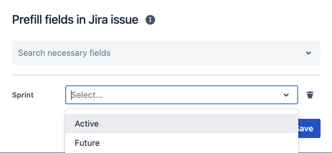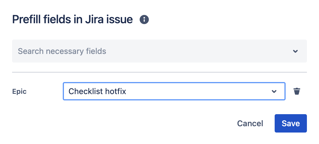 To prefill fields, click the "Prefill fields" button, and then select the required fields from the drop-down menu: epic, label, and sprint. Next, add data to the future task and click "Save" to apply the changes.