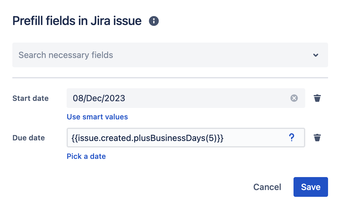 {{issue.created.plusDays(5)}}: Start & Due date equals the date of task creation plus 5 days.