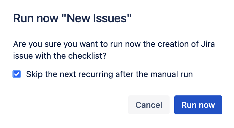 The Run Now feature serves the purpose of instantly executing the checklist creation process for urgent situations, bypassing the need to wait for the next scheduled occurrence. In scenarios where you require immediate checklist creation for an issue, followed by the regularly scheduled occurrences, simply utilize the "Run now" functionality.