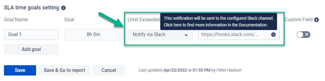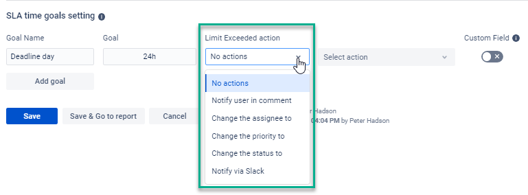 SLA time goals setting lets you set time limits for each SLA configuration and choose the Exceeded actions for issues: