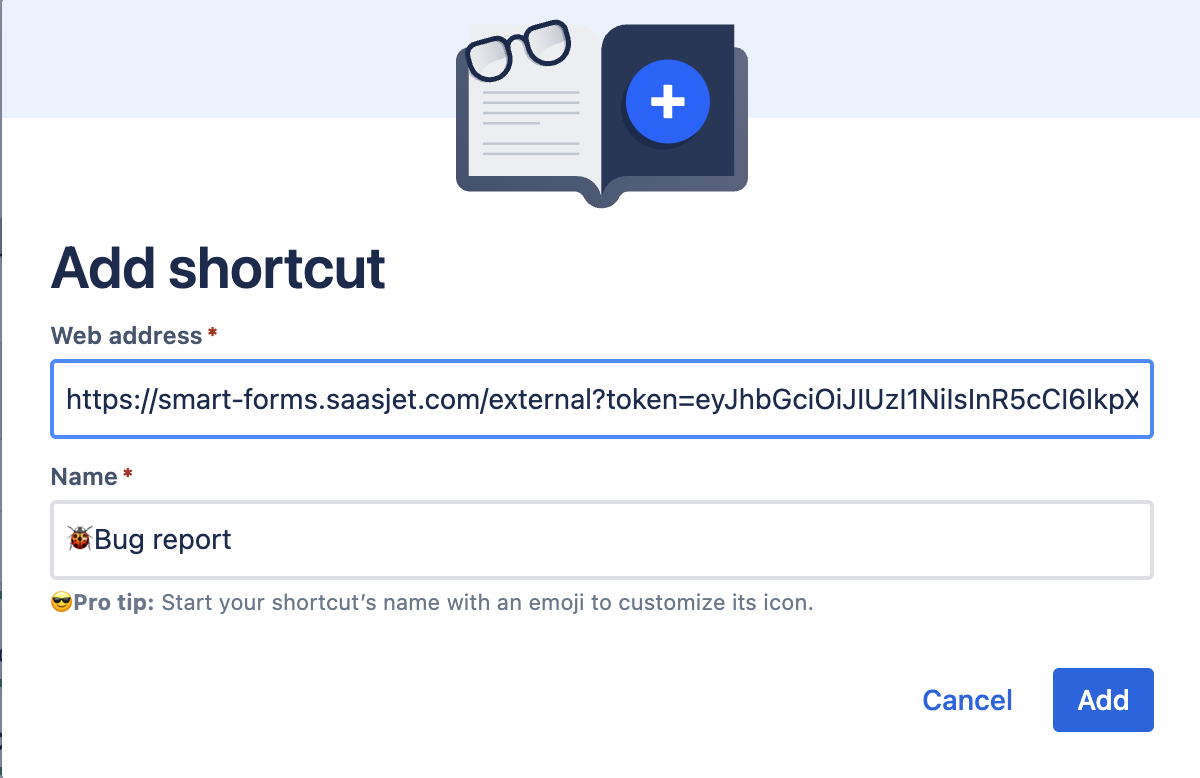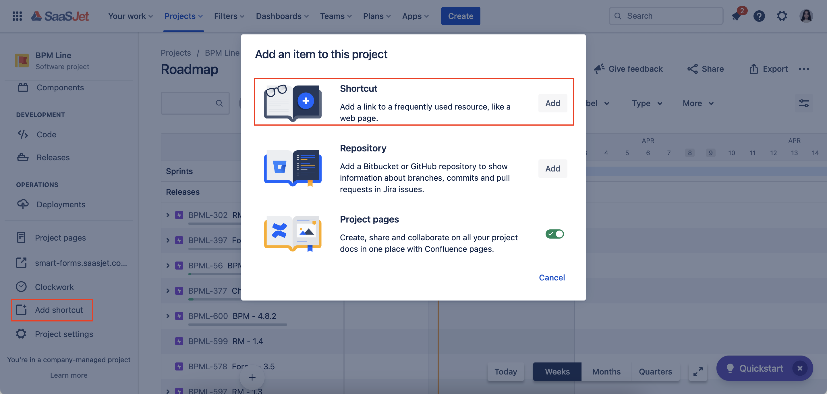 Go to the needed Jira Project and click the Add shortcut button in the Sidebar. Then click the Add button near Shortcut.