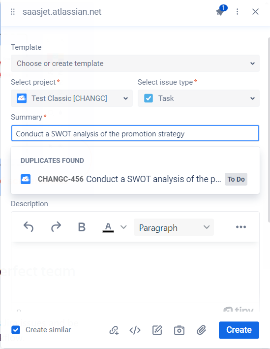 If a task with the same summary you are trying to create already exists in Jira in a particular project, the app will inform you about it.