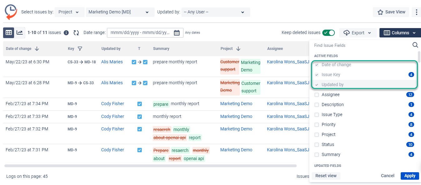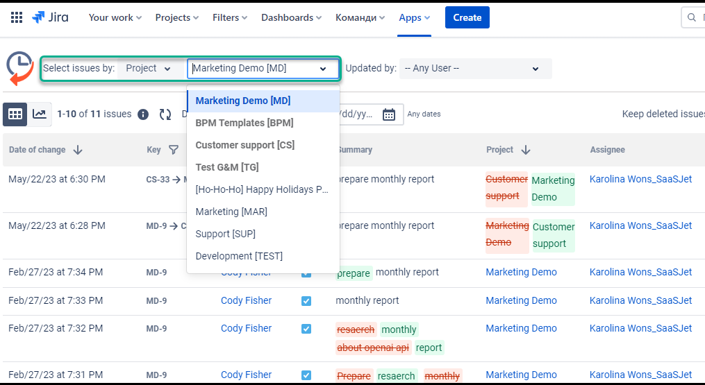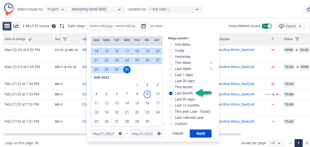If you want to see how many issues and what issues were created in your project for some period of time, follow the steps below. You will find out who created each task and when.