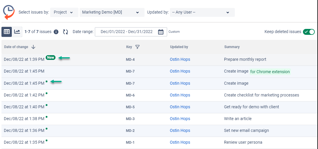 You will get all created tasks in one list. The newly created issues are marked with green dots. Hover the coursor over and you will see it marked as “New”.