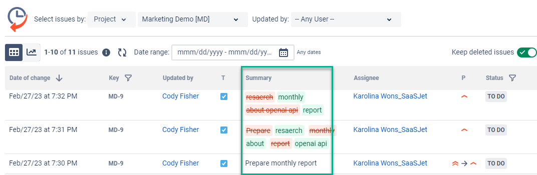 Get audit log of changes with Issue history for Jira. For example, a summary of task was changed: