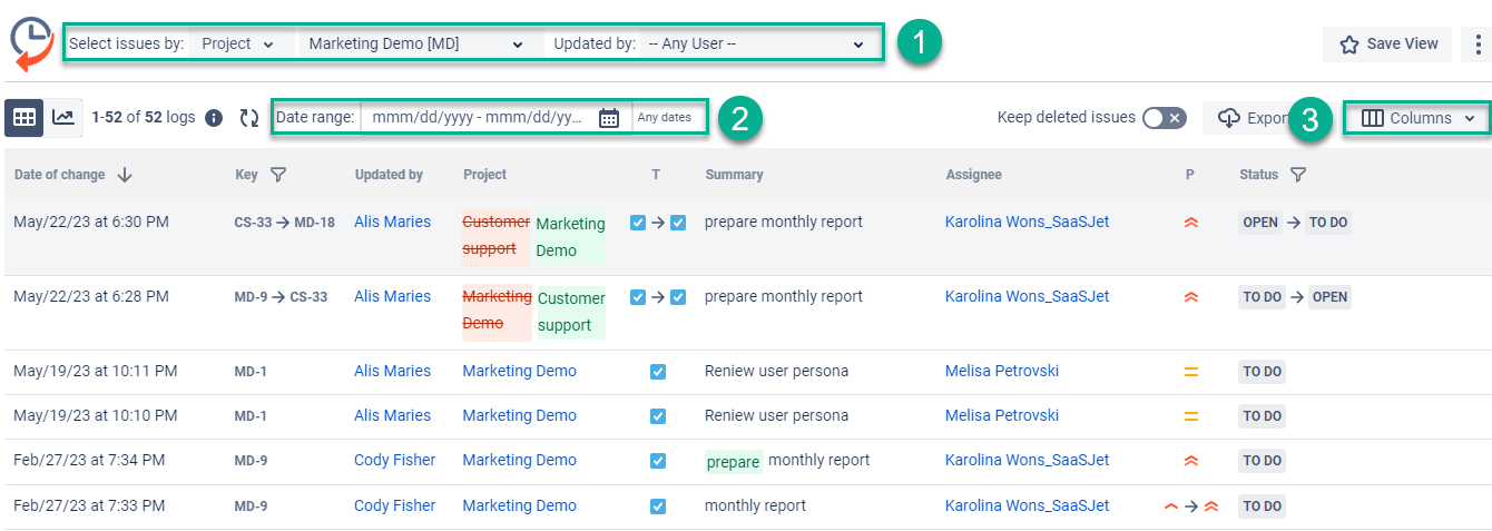 Filter issues by Project, Assignee, Sprint, Label, etc. (depending on where you need to track changes)