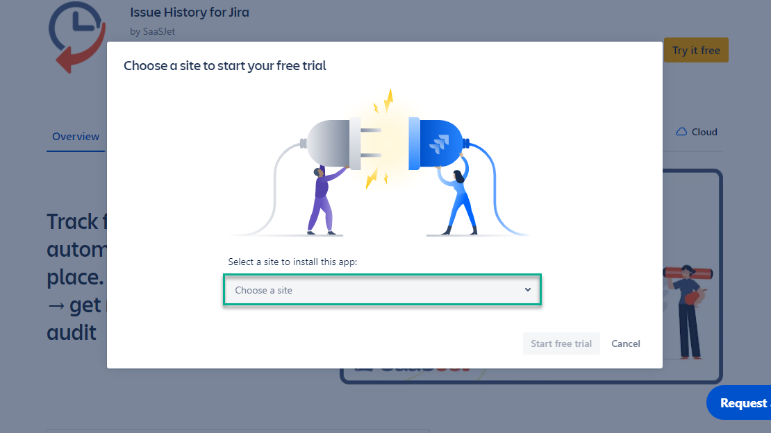 4. Select your site on the atlassian.net to install the add-on, then click "Start free trial."