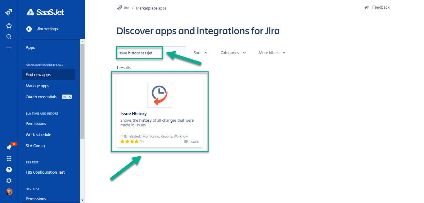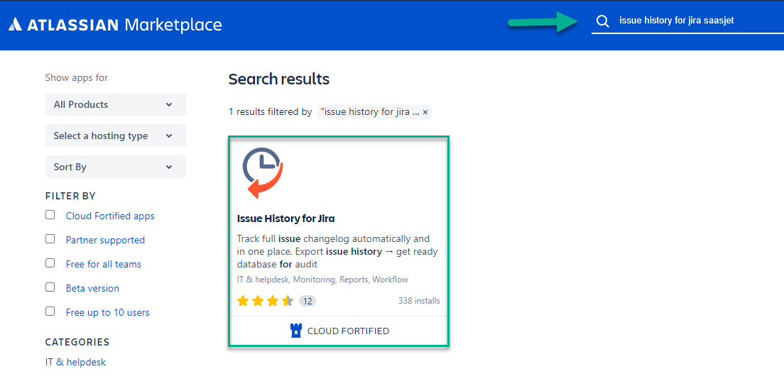 1. Type "issue history for jira saasjet" in the "Search the Marketplace" field.