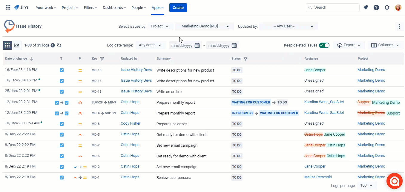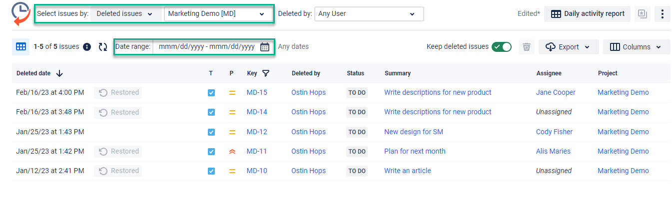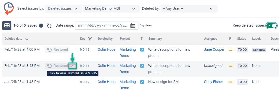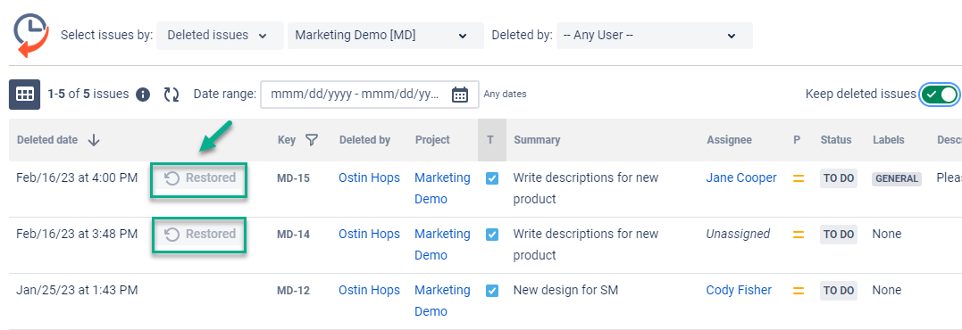 Please remember that storing deleted issues is started only after activating the option. Read how to activate the feature in Keep deleted issues section.