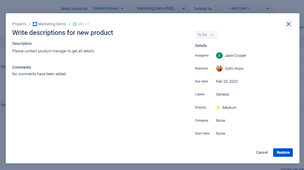 The add-on allows restoring all main issue fields such as assignee, reporter, summary, description, comments, etc.