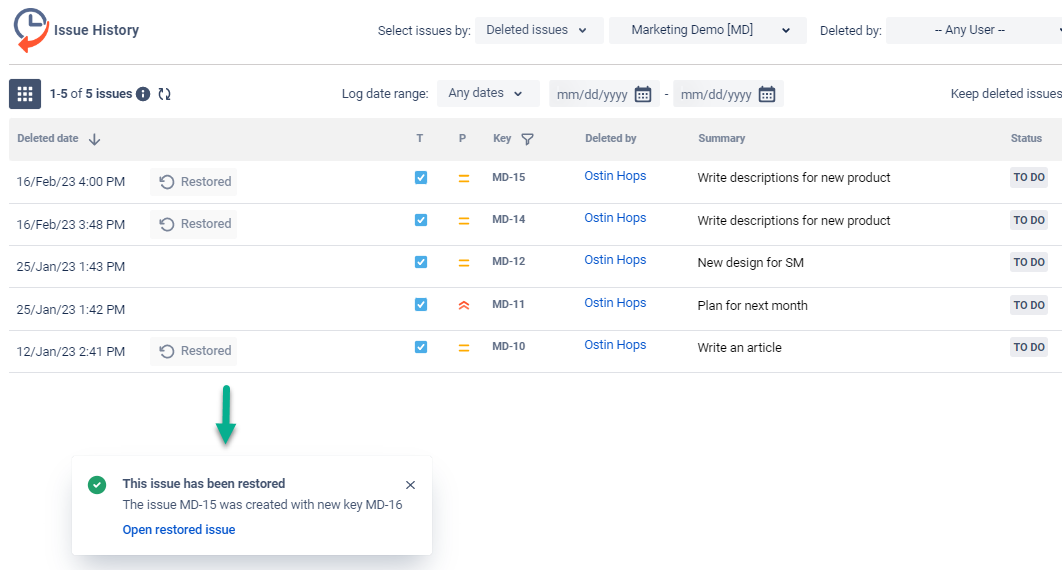 With Issue History for Jira app, you can not only find a deleted issue but restore it to the project where it was deleted.
