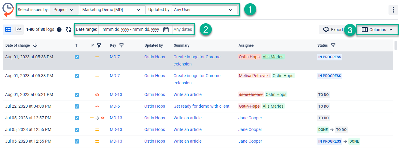 To get the changelog for one or several issues, click the filter icon and get a drop-down list of your issues. Choose the ones you need.