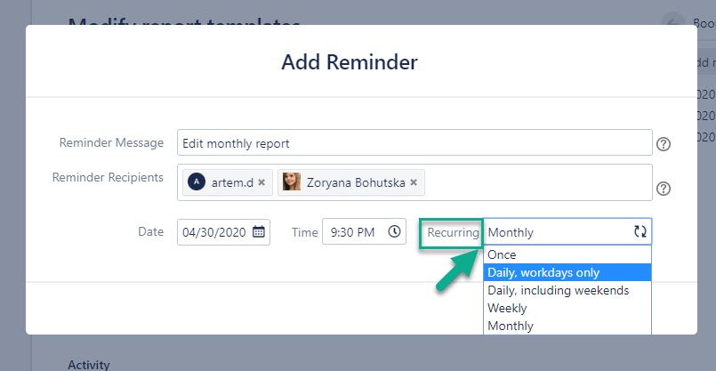 At the Recurring drop-down menu select the reminder frequency.