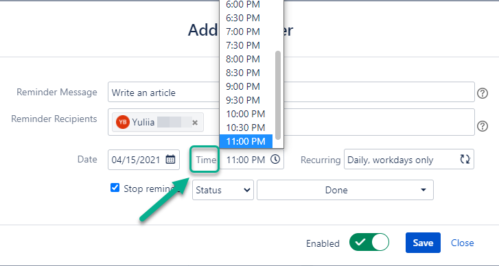After clicking the +Add reminder button, you will be able to add such information:
