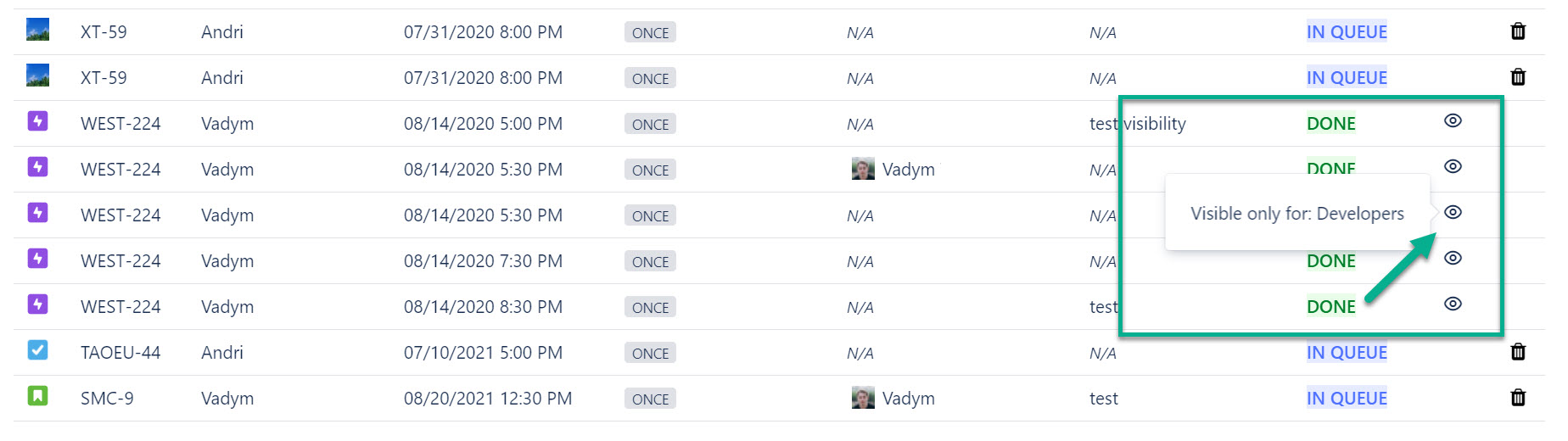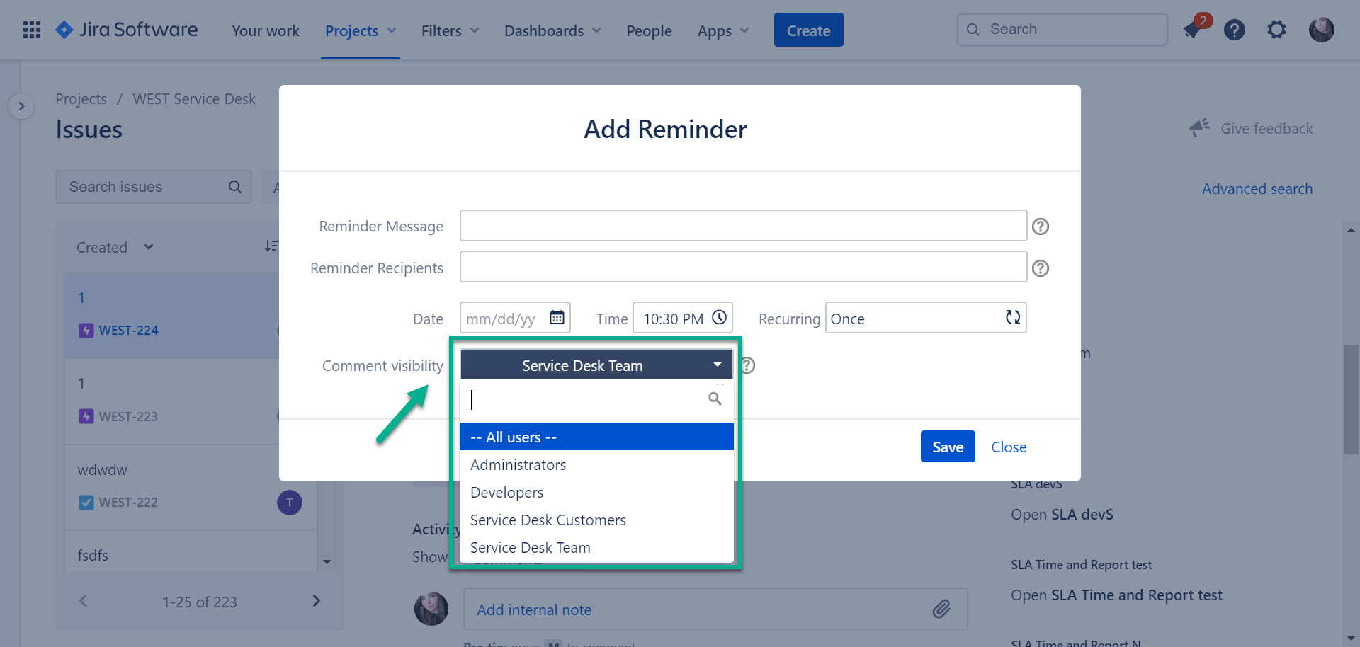 So you can select who can see reminders when adding or editing reminder settings. You can set permission for all users or for one of your Jira groups (administrators, service desk developers, service desk team, etc.)