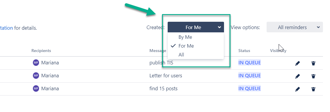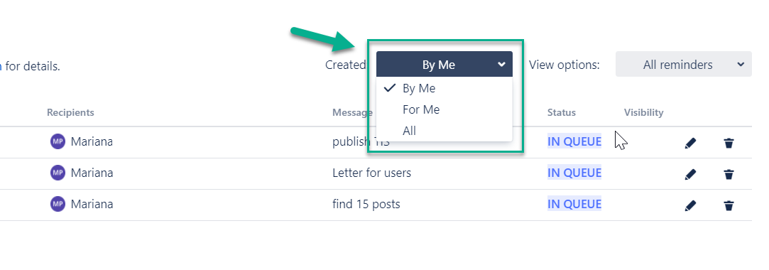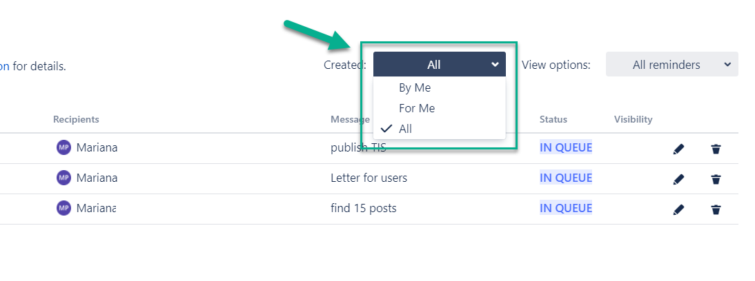 To get reminders, that are created by you, choose “By me” as it is shown below:
