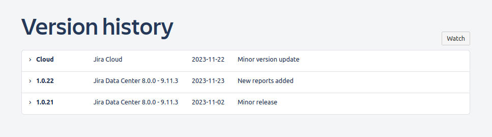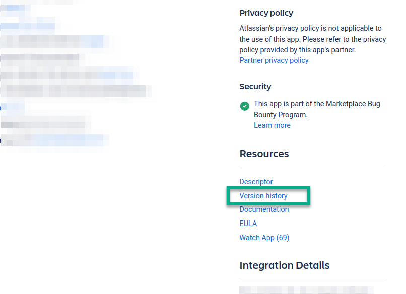 Go to the Atlassian Marketplace and find the product page for the app you want to view the version history.