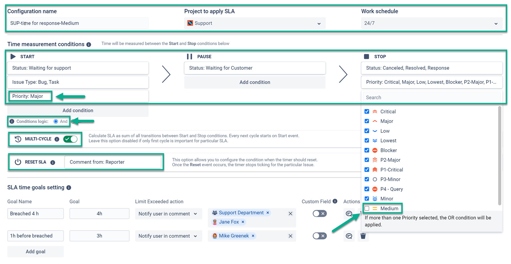 You must specify one priority in the Start condition and set all others to the Stop condition, and set the corresponding SLA Time goals, as shown in the example below.