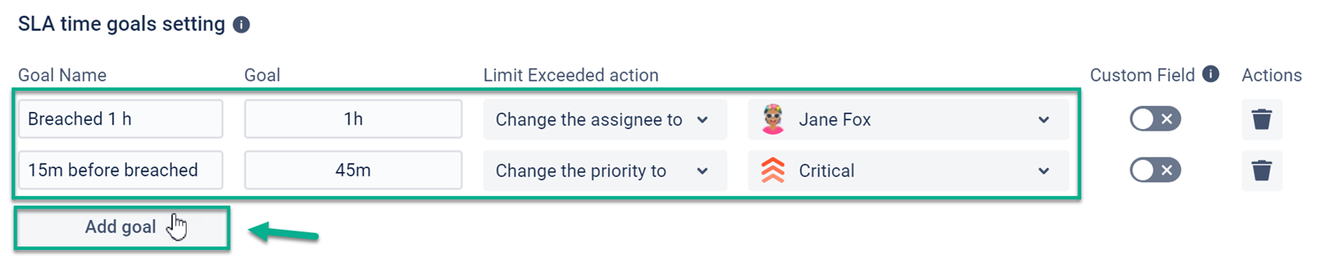 Set required SLA time goals and Limit Exceeded actions according to the deadlines and required actions. For Medium priority, we’ll mention in the ticket the support department group and several responsible users an hour before the deadline and when the SLA is breached.