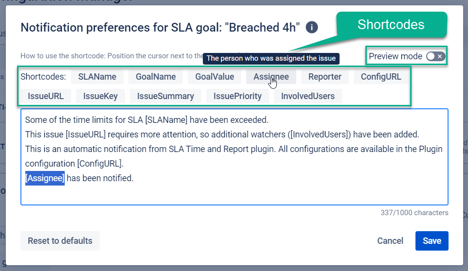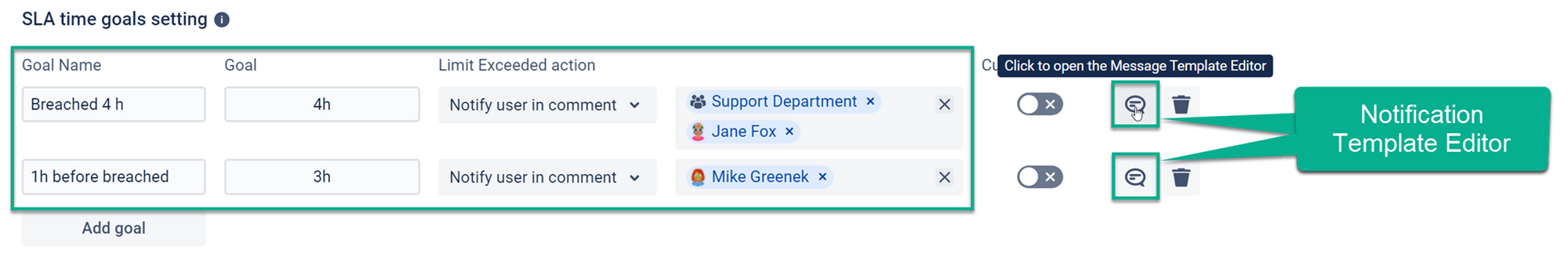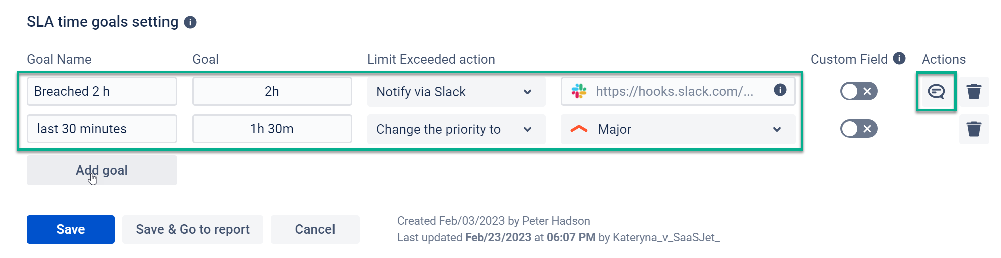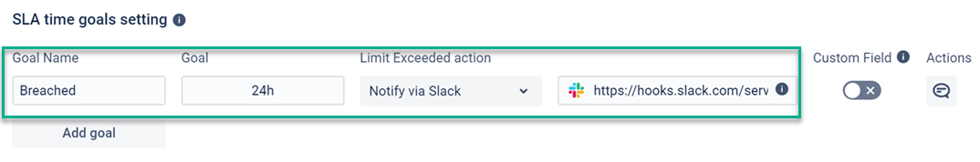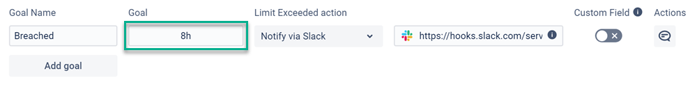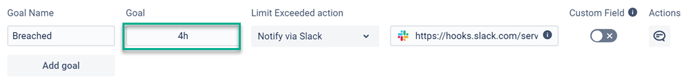 Set the time goals and Limit Exceeded actions for each SLA configuration. In our example, it will be notified via the SLACK channel about Breached time limits.