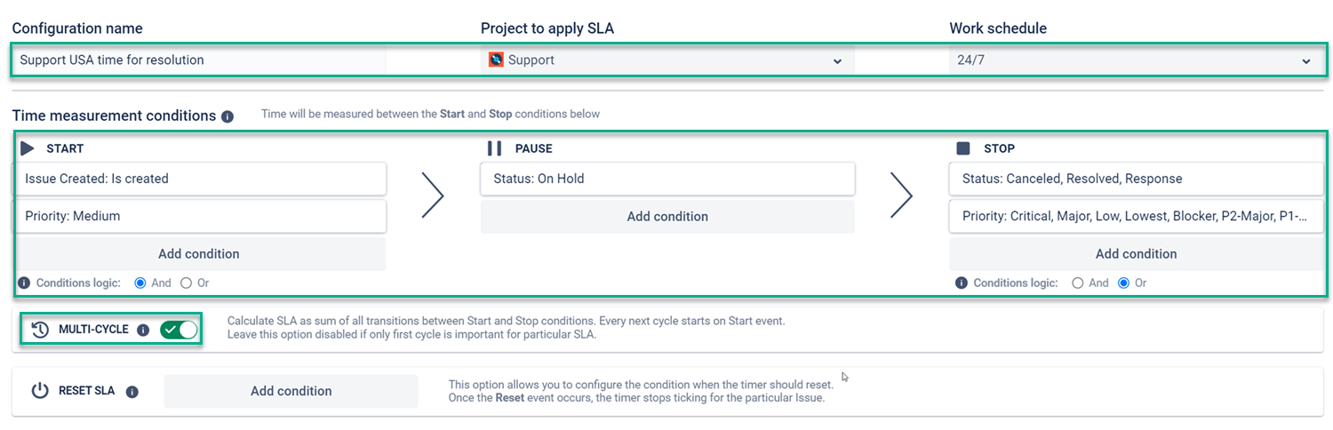 Create three new SLAs for the same Project, using the same Work schedule and Start/Pause/Stop conditions as the previous configurations, excluding the Reset SLA – leave it unconditional.