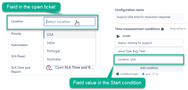 If you have teams in different time zones and need to calculate SLAs for each group, you can add a Location condition – a custom field value which allows teams to select their time zone on the ticket.