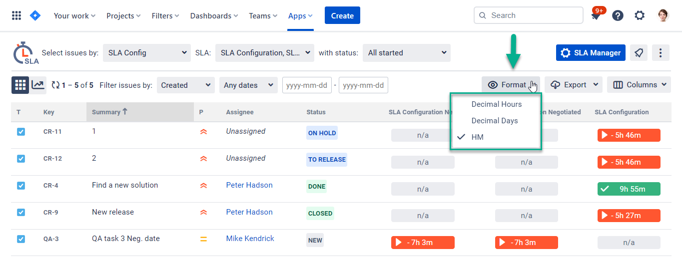 We use different formats of time metrics for the SLA reports. The table-grid report can be in Decimal days, hours and minutes (HM) or only Decimal hours.