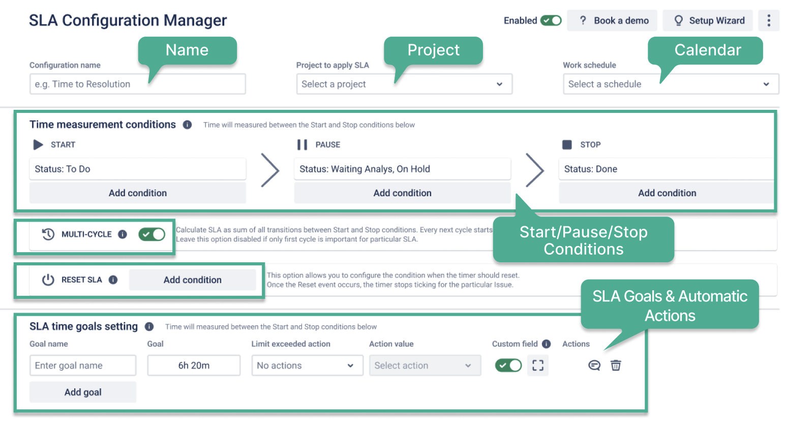 Then, navigate to the SLA settings, click on the "SLA Manager" button, and create a configuration for your project by selecting "+Add new configuration".