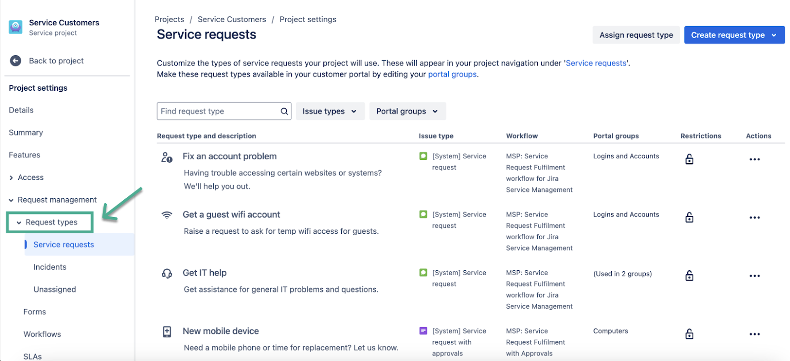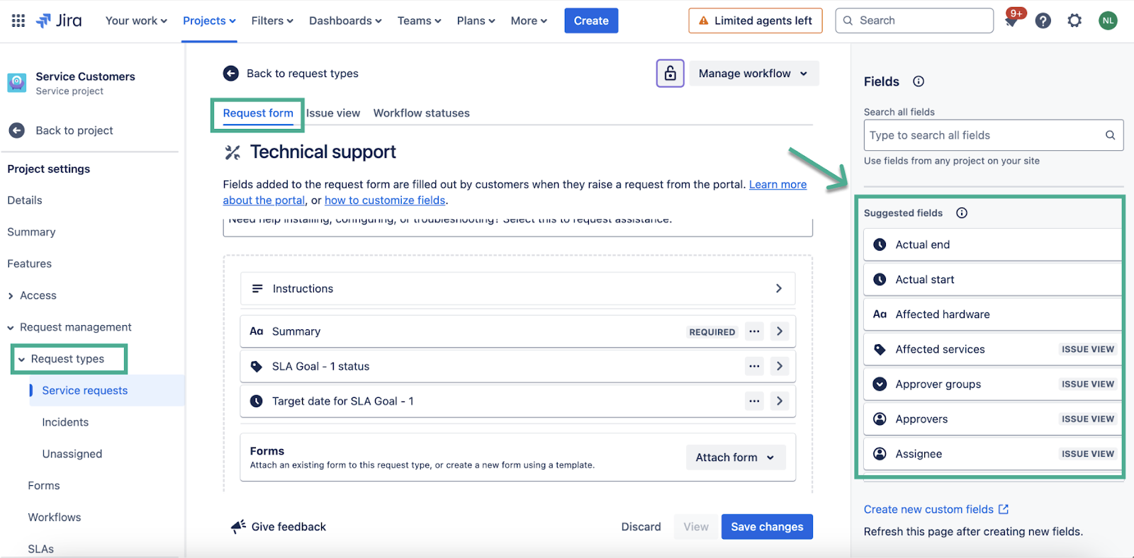 Select the request type you want to add your custom field to (e.g., Service requests). Then, choose a Request form (e.g. Technical support): you can select an existing one or create a new type by filling in the required fields.