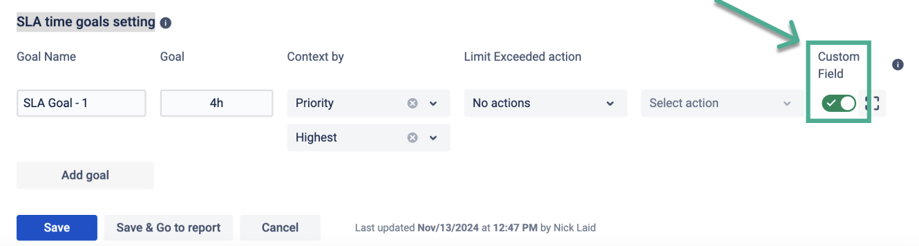 In the SLA goals settings menu, specify SLA goals and select an Automate action for work items that exceed their limits. A critical step here is to enable the Custom Field button.