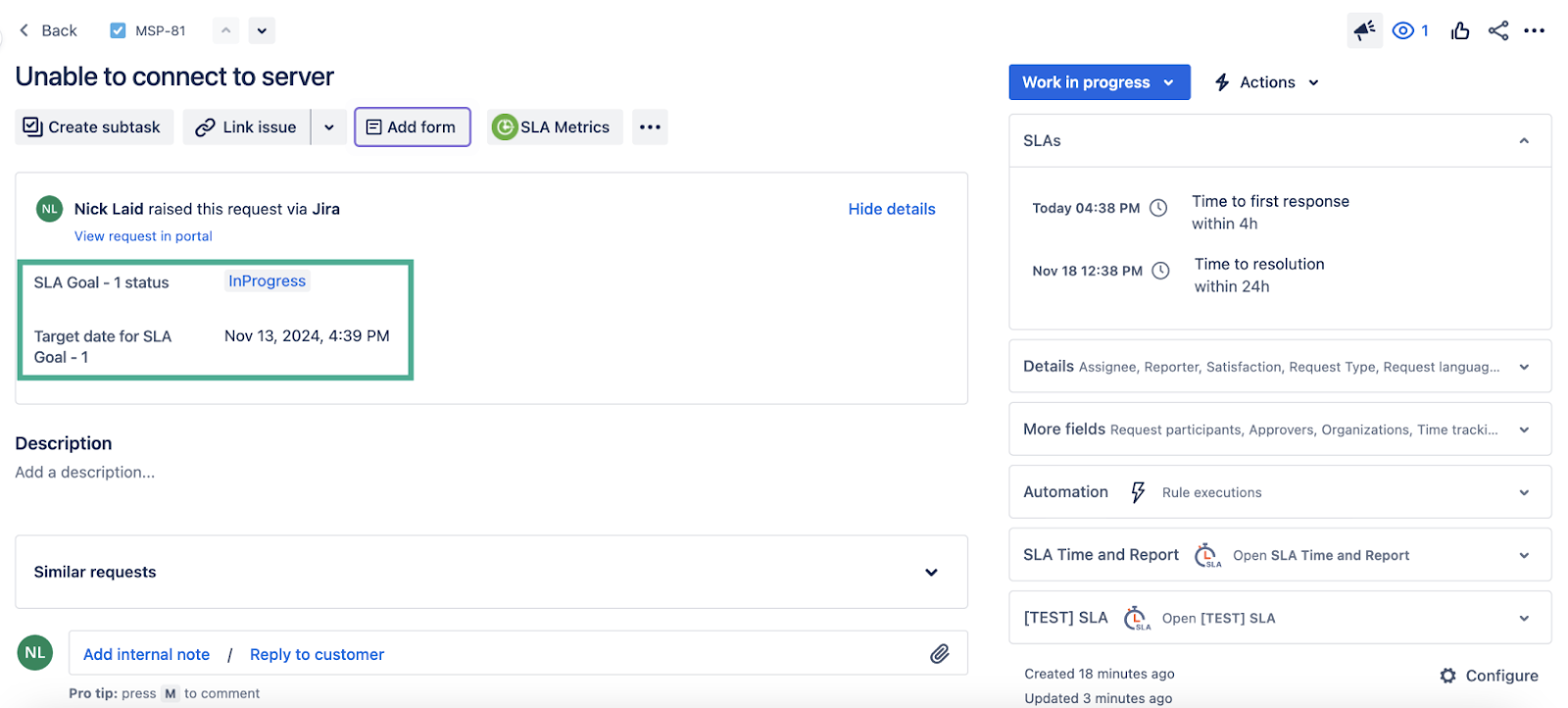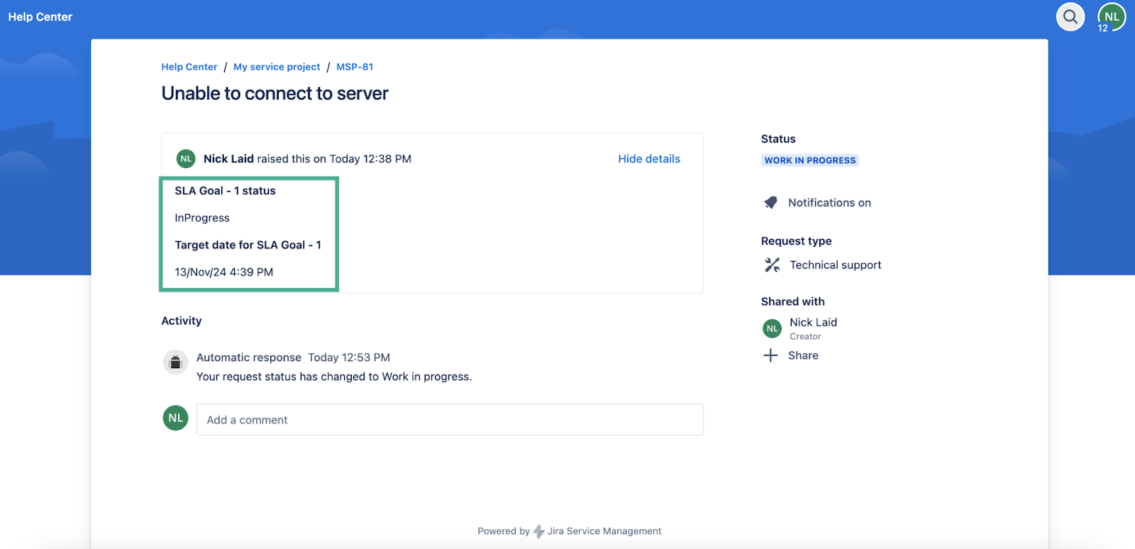 Custom fields will also be visible on the custom portal, allowing you to monitor SLA status and target date in real-time: