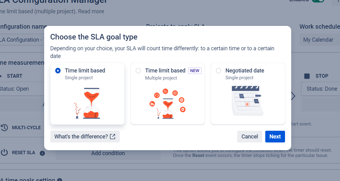 Choose the type of SLA Goal for the new SLA configuration, either based on a time limit or a negotiated date.