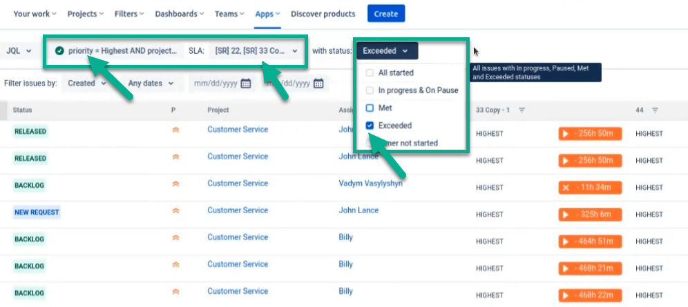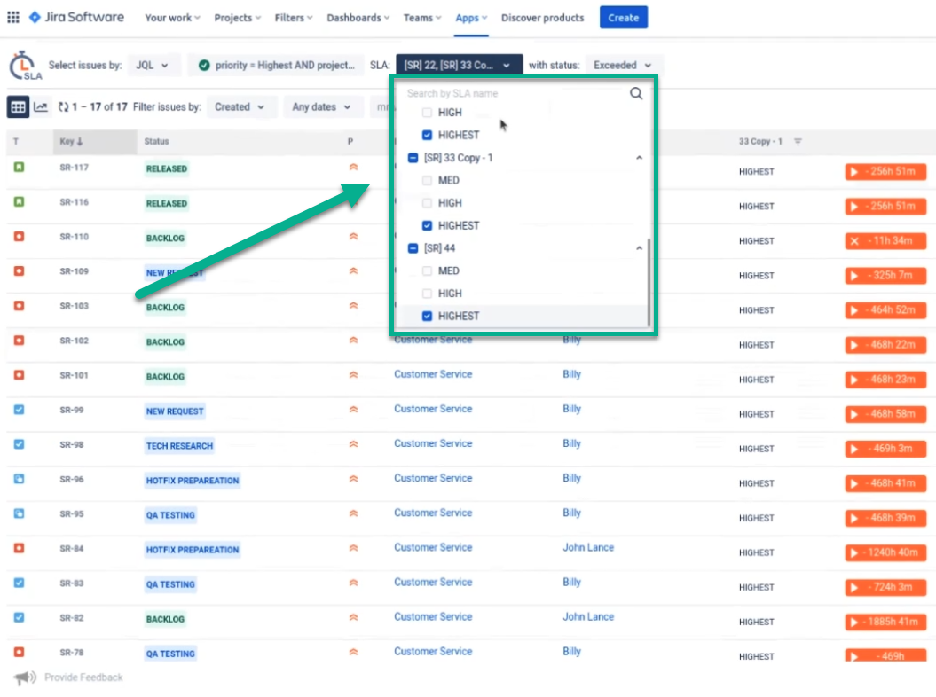 Next, you need to select to display only certain SLA configs and SLA goals that you need, add other conditions if necessary, for example, SLA execution status, and run the filter.