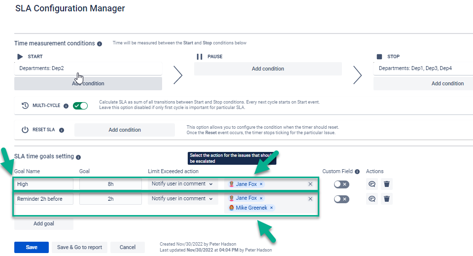 First of all, set up an SLA, define the Start and Stop conditions and SLA goals.