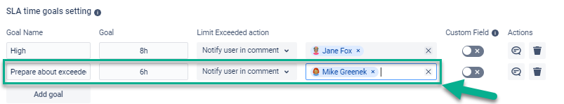 If you want to get reminders, for example, when your SLA goal is breached and/or 2 hours before this, set up sending the notifications in “SLA time goals setting”: