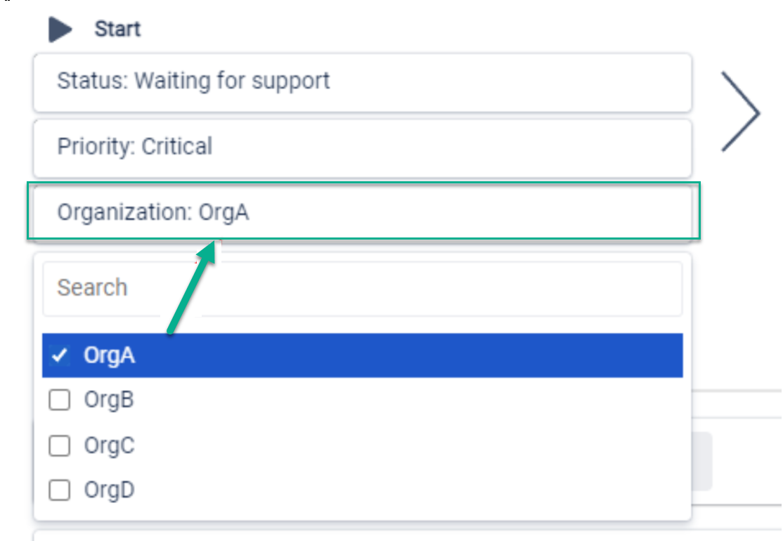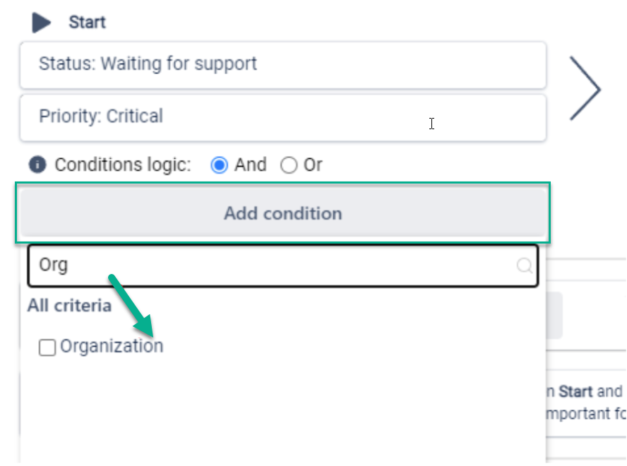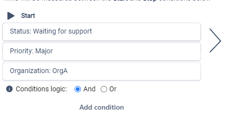 Add the Start conditions = Waiting for support + Priority Major + Organization = OrgA.