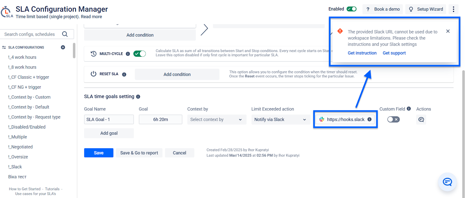 If you've encountered a message in the app after adding a Slack URL in the SLA goal settings, it may be due to Slack's workspace limitations. Below are potential causes and solutions: