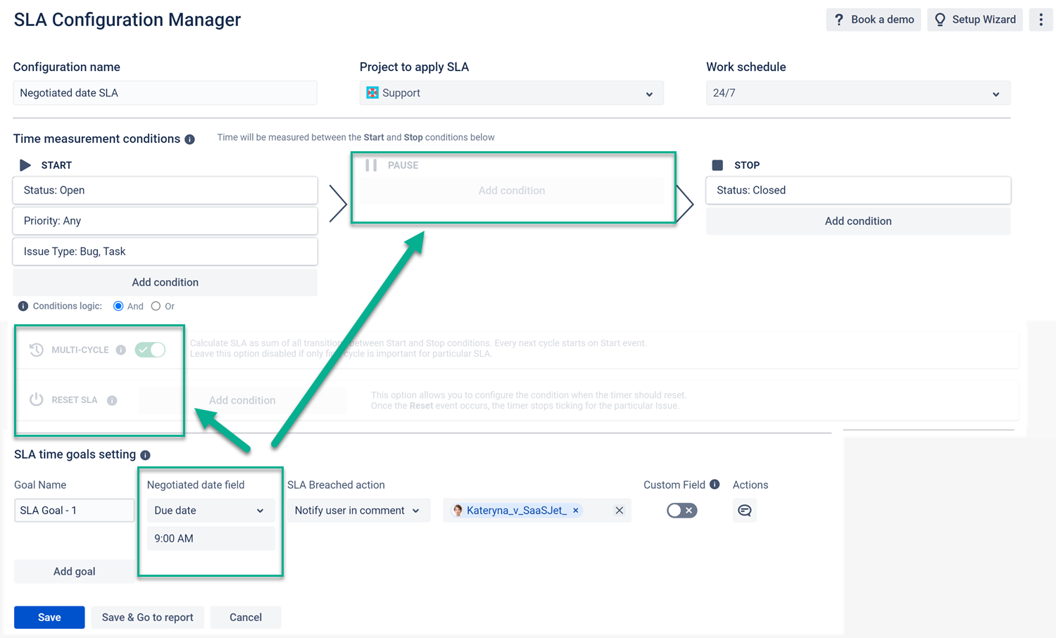 Pay attention that the Pause condition, First/Multi-cycle options, and SLA Reset are disabled for SLA configs with the negotiated date.